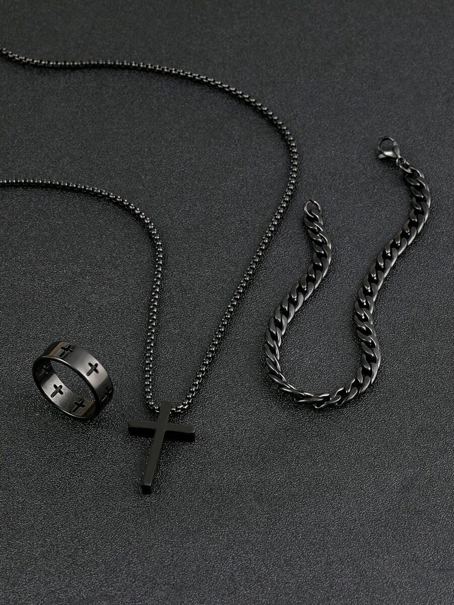 Découvrez cet élégant ensemble de bijoux pour homme comprenant un collier avec pendentif Croix, un anneau distinctif et un bracelet tendance. Fabriqué en acier inoxydable de haute qualité, cet ensemble ajoute une touche raffinée à n'importe quelle tenue. Idéal pour les occasions spéciales ou comme cadeau pour un être cher.