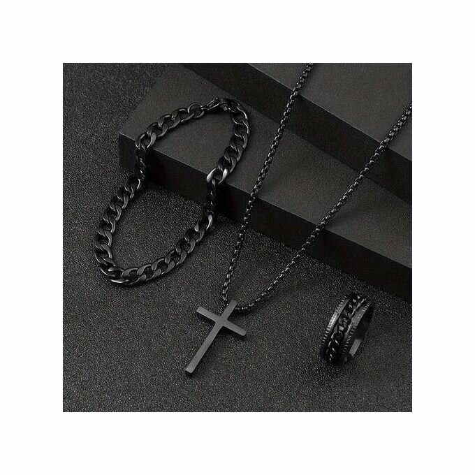 Découvrez cet ensemble de bijoux élégants pour hommes en acier inoxydable noir. Comprenant un collier avec pendentif croix, un bracelet chaîne et une bague sophistiquée, il est idéal pour sublimer votre style au quotidien. Un cadeau parfait pour les amateurs de mode.