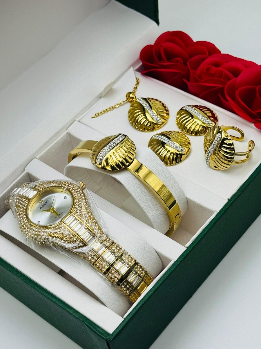 Cet ensemble élégant de bijoux et montre doré est parfait pour sublimer vos tenues. Idéal pour offrir ou se faire plaisir, il comprend une montre sophistiquée et des bijoux assortis. Un choix parfait pour les occasions spéciales.