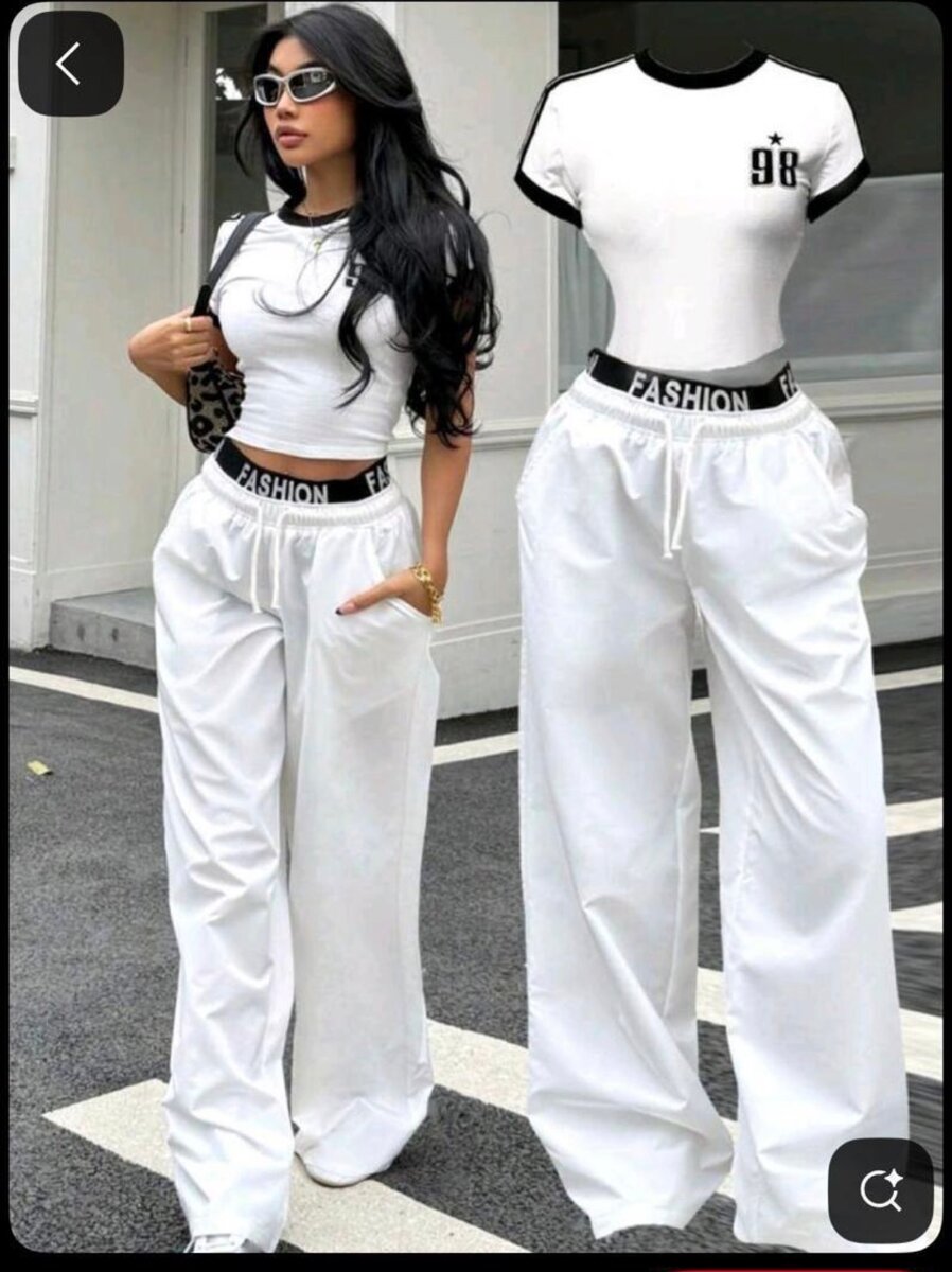 Optez pour ce chic ensemble blanc, parfait pour un look décontracté et tendance. Comprend un haut imprimé 98 et un pantalon ample à taille élastique pour un confort optimal. Idéal pour vos sorties quotidiennes ou une tenue relax à domicile. Alliez style et confort avec cet ensemble incontournable.