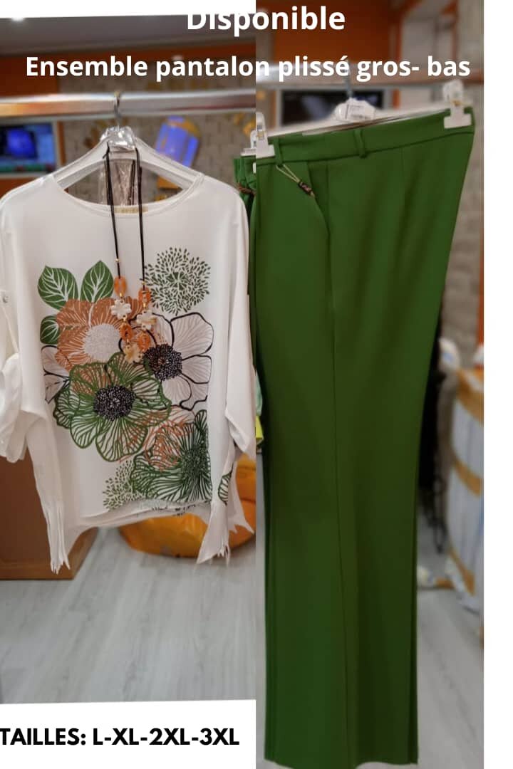 Élégant ensemble blouse à motif floral et pantalon vert. Confortable et chic, idéal pour une tenue décontractée raffinée. Disponible en tailles L