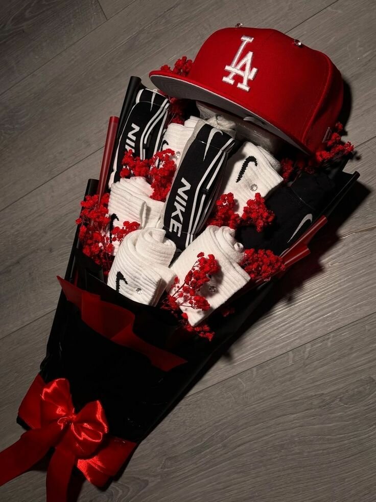 Offrez un cadeau unique avec cet ensemble comprenant des chaussures Nike blanches et une casquette rouge LA. Un choix idéal pour les amateurs de sportswear.