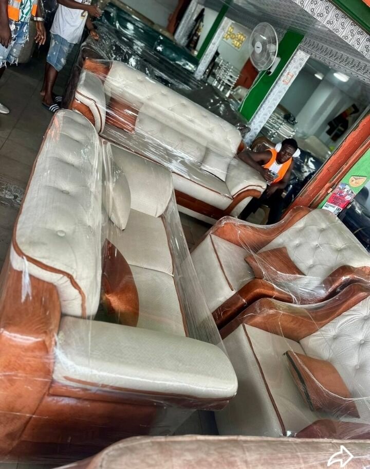 Ensemble canapé en cuir marron et crème, design élégant et confortable. Convient pour les salons modernes. Facile à entretenir et durable.