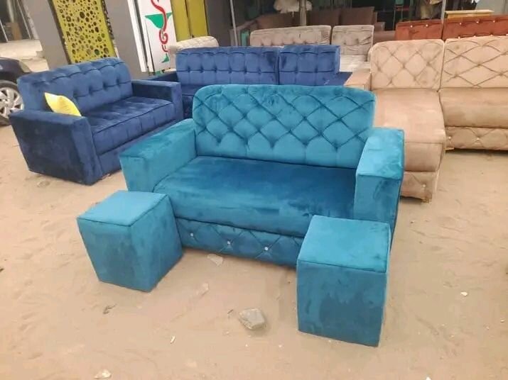 Ensemble canapé et fauteuils design capitonné en velours de haute qualité. Confortable et élégant, parfait pour votre salon. Facile à entretenir et durable.