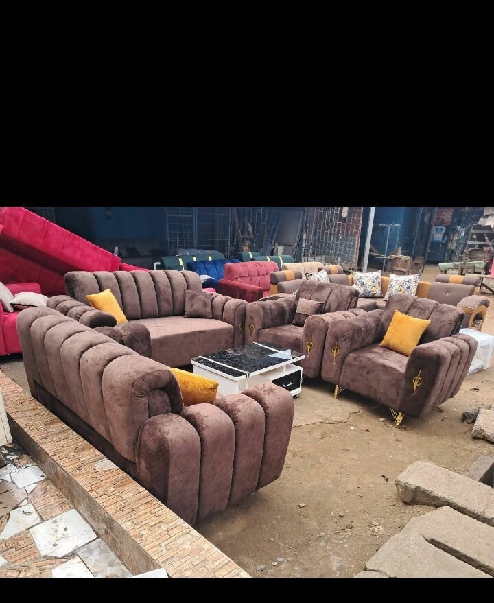 Ensemble canapé marron avec fauteuils, design moderne et confortable. Idéal pour salon, facile à entretenir.