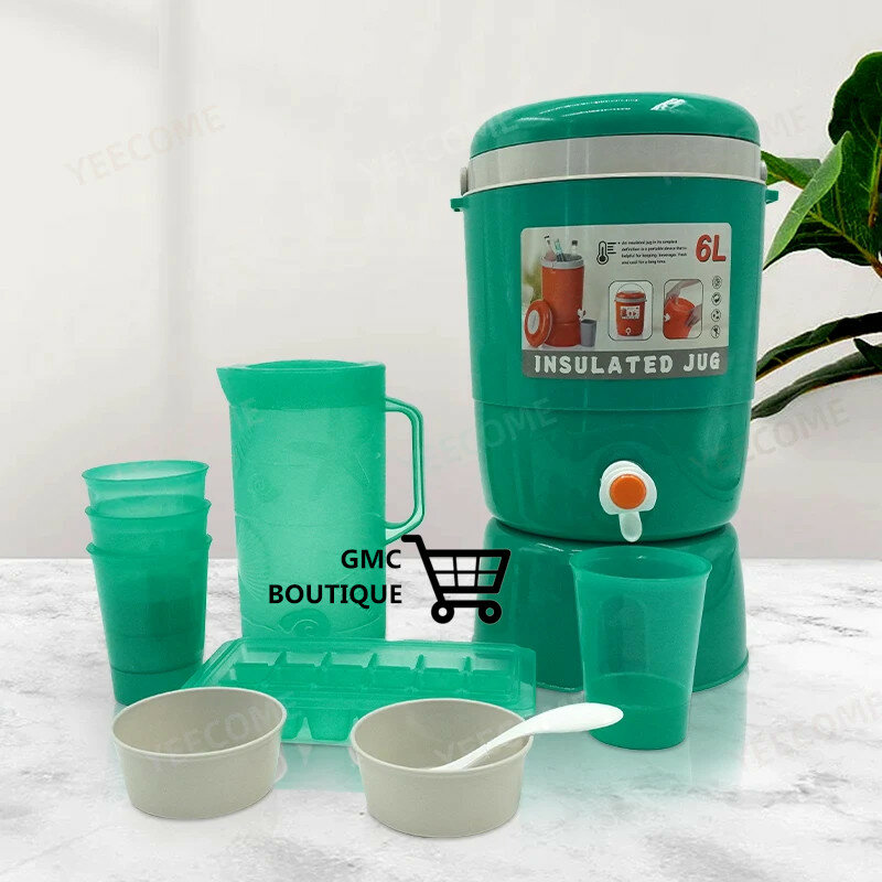 Couleur Disponible: Orange - Vert - Gris Ce kit contient: 01 Glacière de 6 Litre 01 Carafe de 2 Litre 04 Gobelet de 350ML 02 Mini Assiette à Repas 01 Bac à glace 01 Fourchette/Cuillère 01 Support de Pose de Glacière