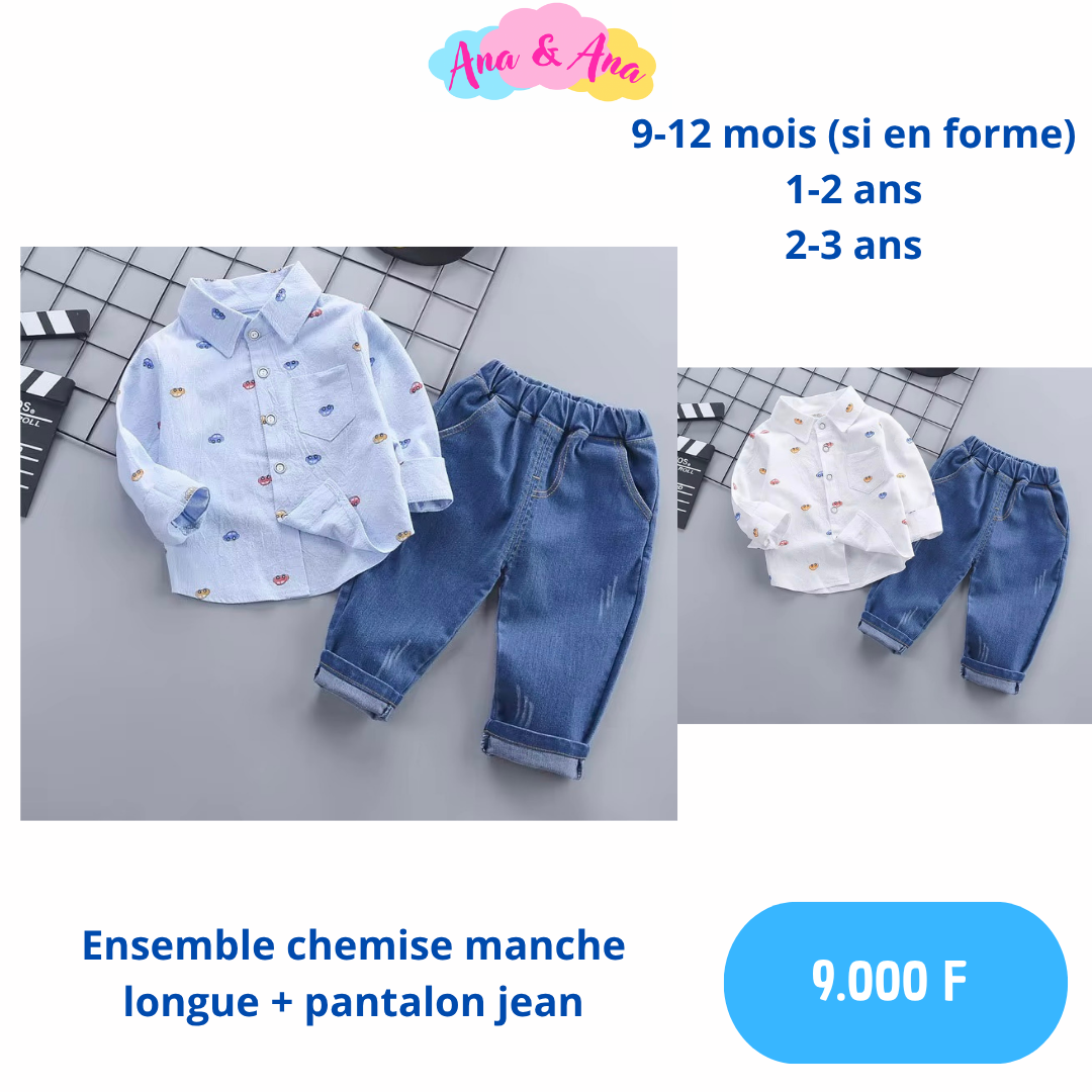 Un ensemble adorable pour les petits : chemise à manches longues avec motifs amusants et pantalon jean confortable. Idéal pour une tenue quotidienne chic et pratique. Disponible pour les enfants de 9 mois à 3 ans. Faites plaisir à votre enfant avec style et confort !