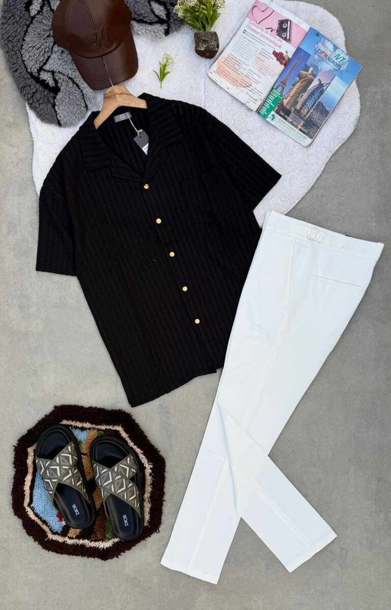 Optez pour cet ensemble chic composé d'une chemise noire à boutons dorés et d'un pantalon blanc élégant. Parfait pour un look décontracté mais stylé, idéal pour les sorties en ville ou les occasions spéciales.