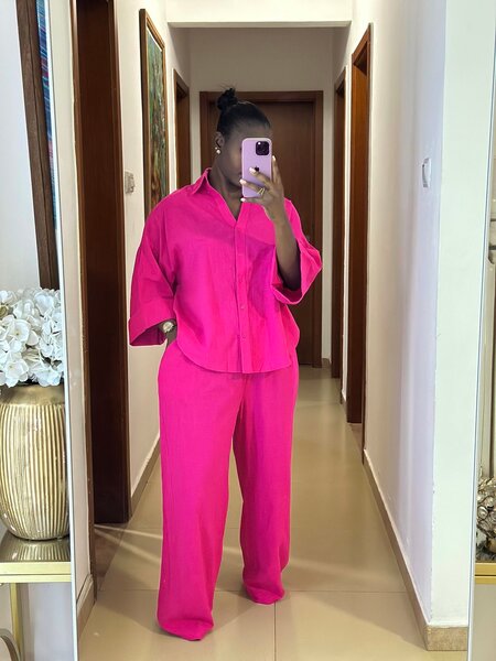 Optez pour cet ensemble chic et confortable de chemise et pantalon assortis. Parfait pour le bureau ou vos sorties, ce duo garantit élégance et aisance. Disponible dans des couleurs vives pour égayer votre garde-robe. Un choix idéal pour les femmes modernes!