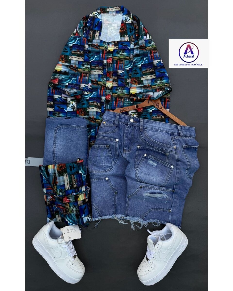 Explorez votre style avec cet ensemble chemise à motifs vibrants et short en denim. Parfait pour un look estival décontracté, complété par des baskets blanches élégantes. Idéal pour les vacances, sorties en plein air ou simplement se démarquer au quotidien. Confort et tendance assurés.