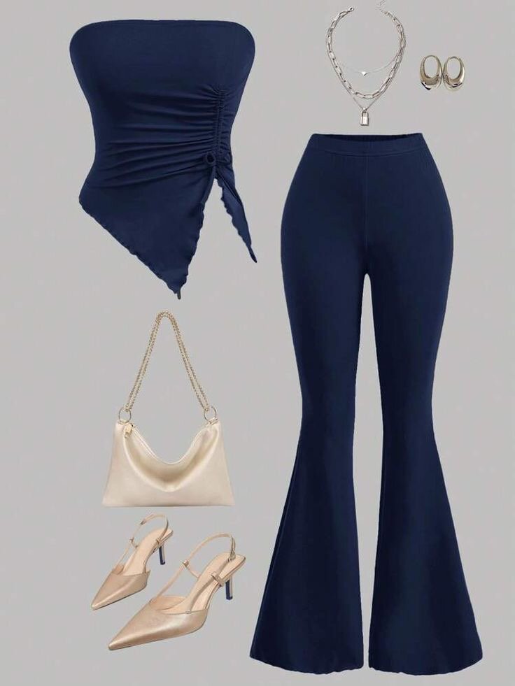 Optez pour cet ensemble chic et tendance en bleu nuit. Comprend un top asymétrique et un pantalon évasé flatteur. Parfait pour une soirée élégante ou une sortie en ville. Complétez votre style avec des accessoires dorés et des talons pour un look sophistiqué.
