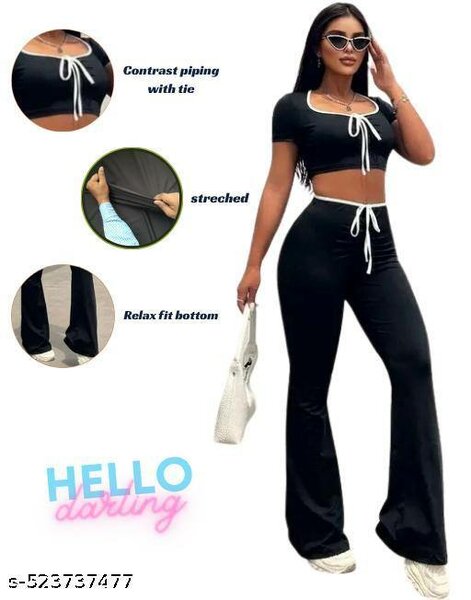 Découvrez cet ensemble chic en noir, parfait pour un look casual et stylé. Comprenant un crop top avec détails à lacets et un pantalon évasé, il est idéal pour les sorties en ville. Confort et élégance assurés. Portez-le avec des baskets ou des talons pour une touche finale parfaite.