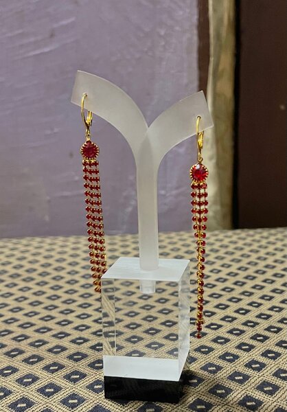 Parure comprenant un collier long avec des perles rouges et des perles dorées et des boucles d'oreilles assorties. Cet ensemble élégant est idéal pour les occasions spéciales ou pour ajouter une touche de sophistication à votre tenue quotidienne.