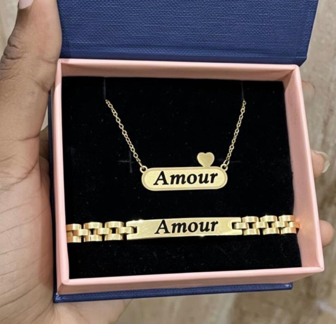 Cet ensemble élégant comprend un collier et un bracelet en plaqué or avec le mot 'Amour'. Parfait pour les amoureux, cet ensemble est idéal pour offrir ou se faire plaisir. Il est présenté dans une boîte cadeau raffinée.