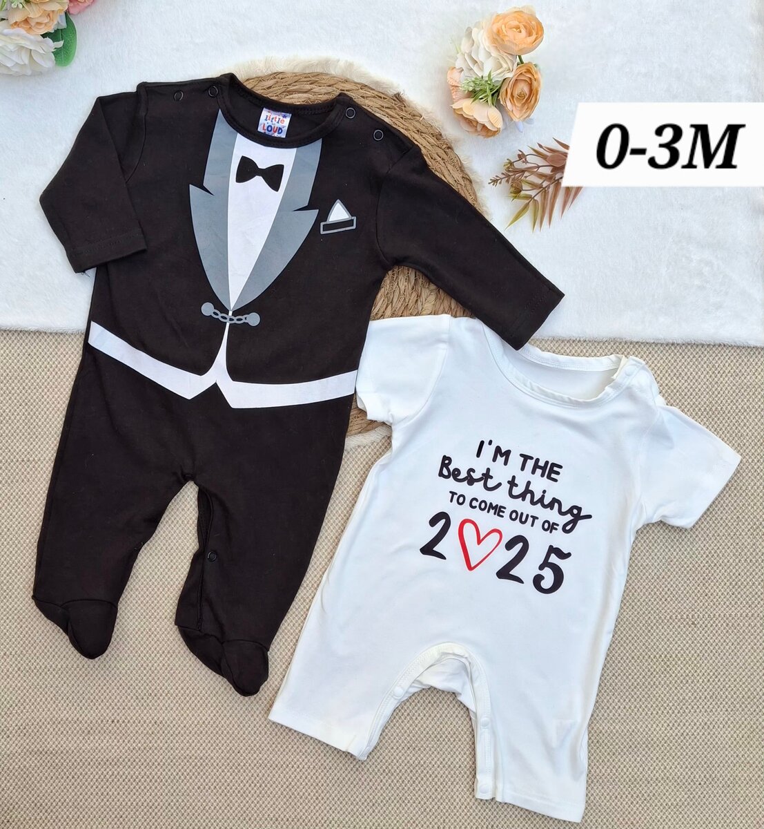 Ensemble bébé garçon composé d'une combinaison noire avec motif smoking et un body blanc avec inscription. Conçu pour les tout-petits de 0 à 3 mois. Idéal pour les occasions spéciales.