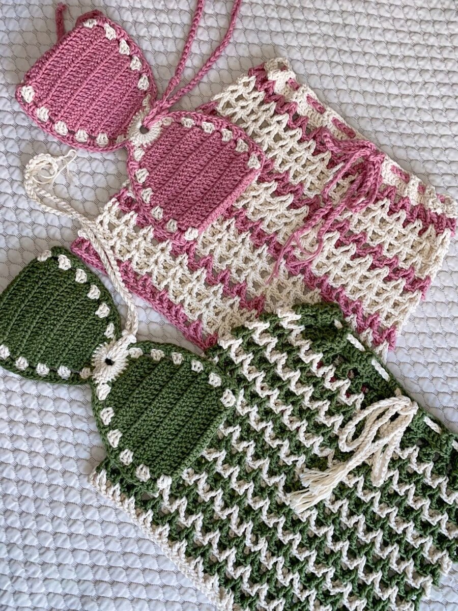Découvrez notre ensemble bikini crochet fait main, idéal pour un été tendance à la plage ou à la piscine. Confortable et stylé, il est disponible en motifs rose et vert. Fabriqué avec amour, c'est le choix parfait pour se démarquer lors de vos vacances.