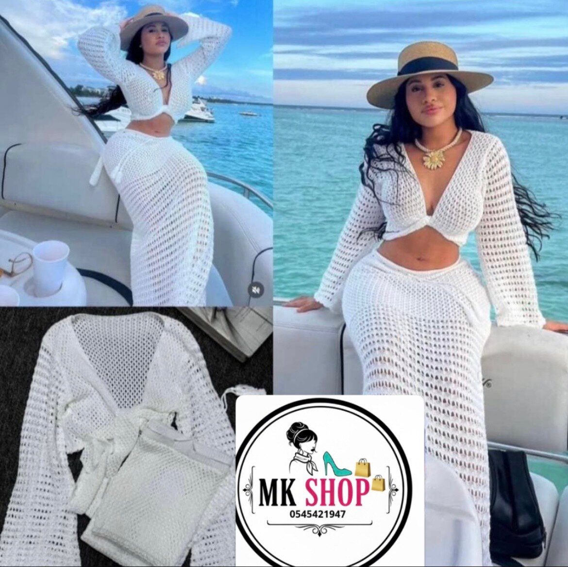 Ensemble deux pièces en crochet blanc idéal pour la plage. Conçu pour les femmes élégantes, cet ensemble comprend un haut et une jupe assortis. Parfait pour les vacances ou les sorties à la plage.