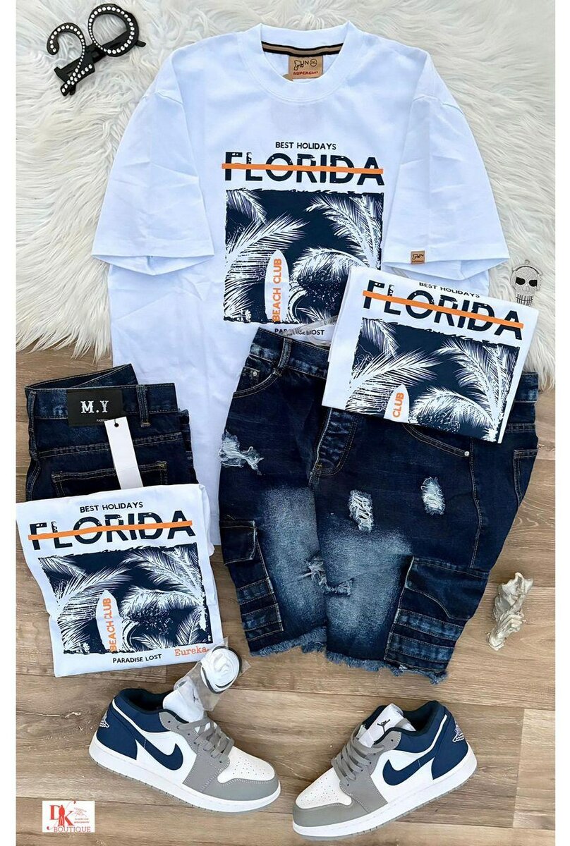 Découvrez cet ensemble d'été décontracté pour hommes, idéal pour des vacances stylées en Floride. Comprend un t-shirt à motif palmiers, un short en jean déchiré et des baskets confortables. Parfait pour les journées ensoleillées et les explorations urbaines.