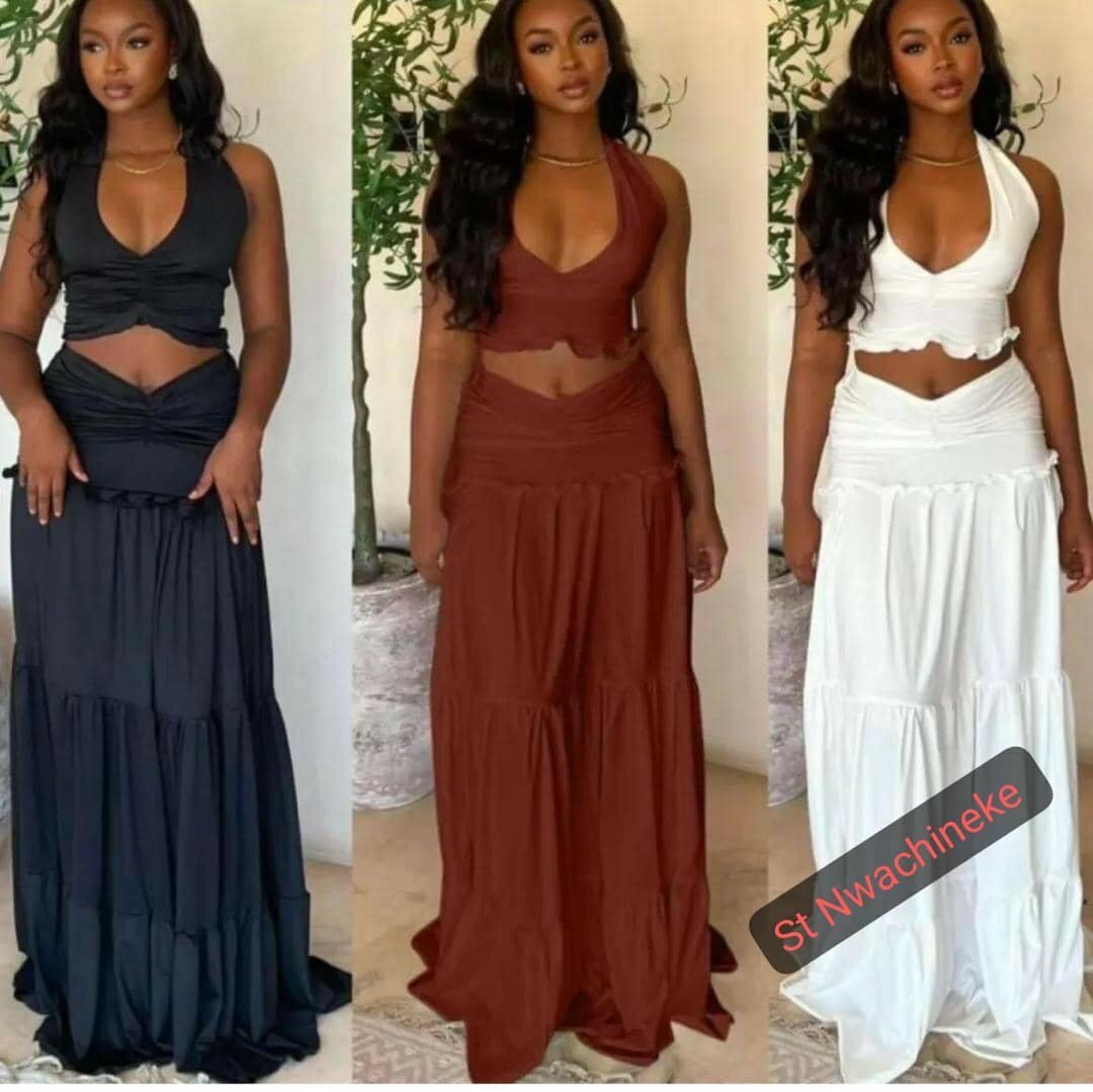 Sublimez votre été avec cet ensemble jupe longue et top dos-nu. Parfait pour les soirées estivales, ce vêtement offre une allure chic et confortable.