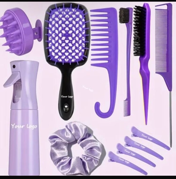 Ensemble complet d'accessoires de coiffure violets comprenant un sèche-cheveux, des brosses, des peignes, des pinces et un spray. Idéal pour les femmes qui prennent soin de leurs cheveux.