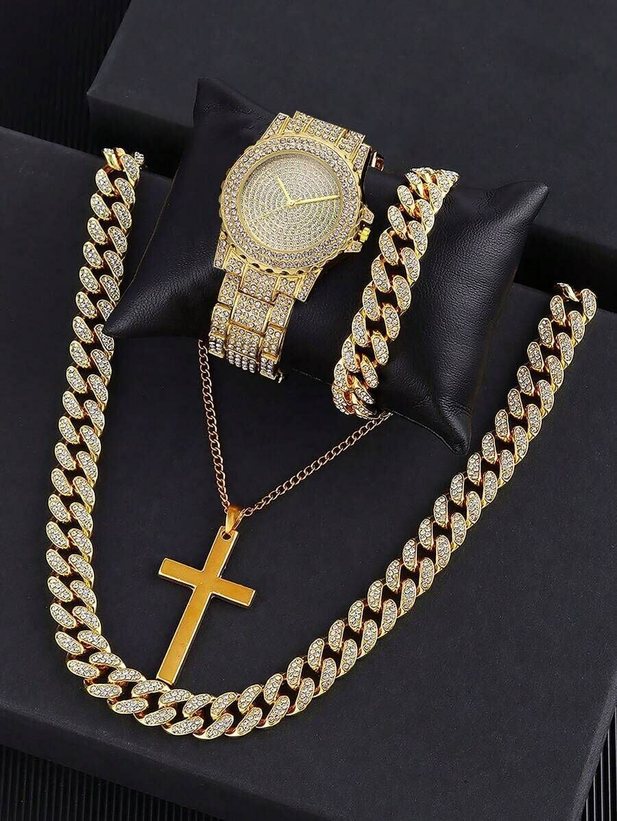 Découvrez cet ensemble de luxe comprenant une montre, un collier et un bracelet en or, ornés de détails élégants et d'une croix pendentif. Parfait pour les hommes qui recherchent une touche de sophistication et de style.