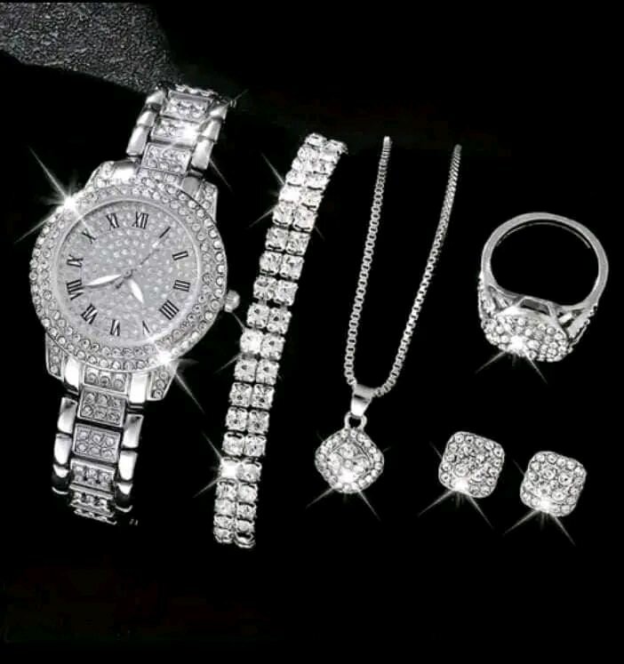 Découvrez cet ensemble élégant comprenant une montre, un collier, des boucles d'oreilles, un bracelet et une bague. Conçu pour les femmes qui aiment le luxe et l'élégance.