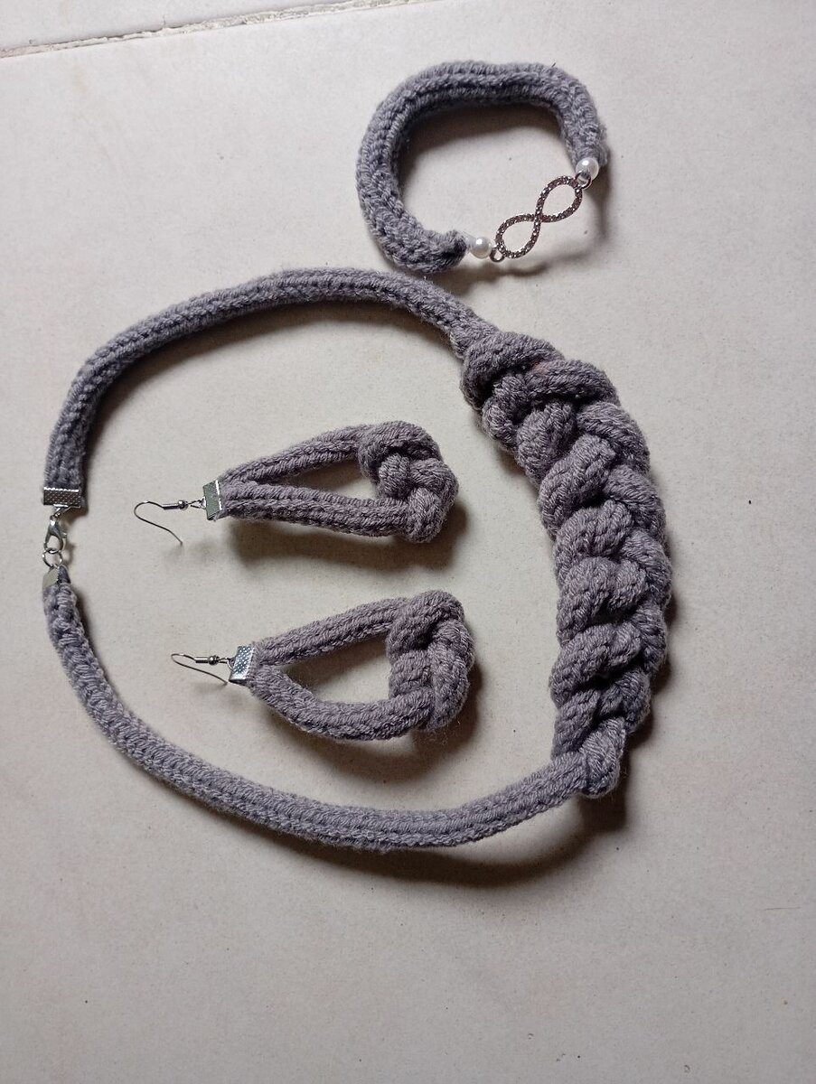 Bijoux tricotés à la laine coton douce. 3 pièces : chaîne, boucles d'oreilles, bracelet disponible de couleur gris