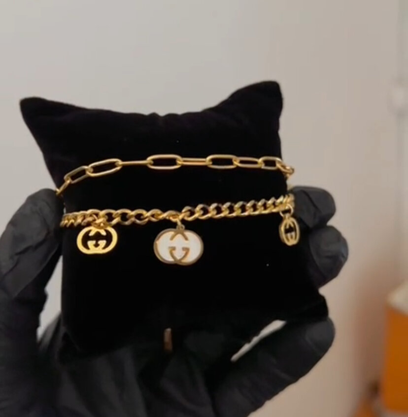 Découvrez cet élégant ensemble de bracelets en or, parfaits pour ajouter une touche de sophistication à votre tenue. Les bracelets sont ornés de pendentifs distinctifs, idéals pour les femmes qui aiment les bijoux uniques et élégants.