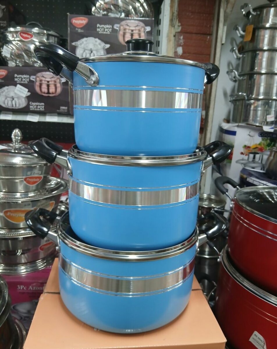 Ensemble de casseroles en aluminium avec revêtement non-adhésif. Poignées ergonomiques et couvercles inclus. Idéal pour la cuisson quotidienne.