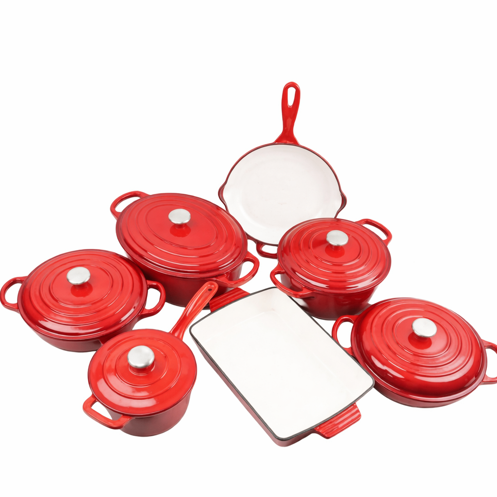 Découvrez cet ensemble de casseroles en fonte rouge comprenant des casseroles, une poêle et un plat à four. Parfait pour la cuisson et la présentation, cet ensemble est idéal pour les amateurs de cuisine.