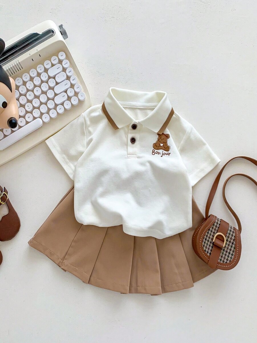 Ensemble de col polo et jupe à manches courtes plissé au style préppy de fille bébé avec dessin animé