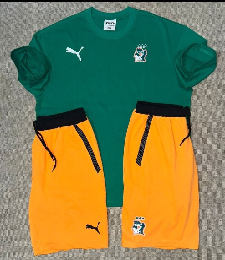 Montrez votre soutien avec cet ensemble de football Côte d'Ivoire, comprenant un maillot vert et un short orange. Parfait pour les matchs et l'entraînement.