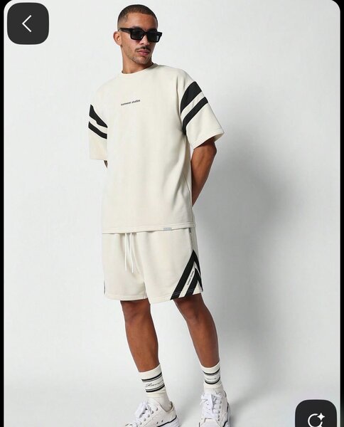 Ensemble de jogging confortable en coton, parfait pour le sport ou la détente. T-shirt et short assortis avec des motifs modernes. Idéal pour un look décontracté et stylé au quotidien.