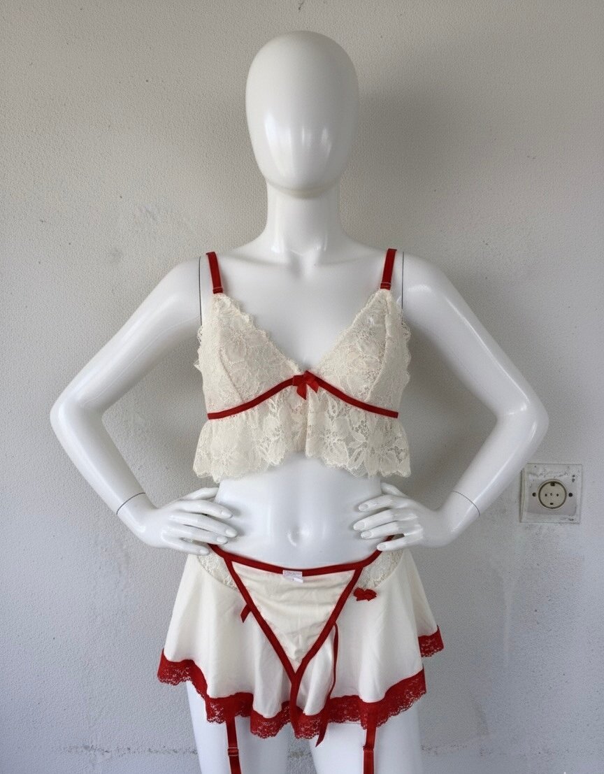 Ensemble de lingerie sexy en dentelle blanche avec des accents rouges. Idéal pour des occasions spéciales, offrant à la fois confort et élégance. Parfait pour surprendre et se sentir séduisante.