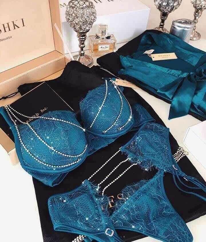 Ensemble de lingerie en dentelle bleue avec ornements élégants. Parfait pour des occasions spéciales, alliant style et confort. Conçu pour accentuer la silhouette avec des détails exquis et un ajustement impeccable. Idéal pour se sentir belle et confiante.