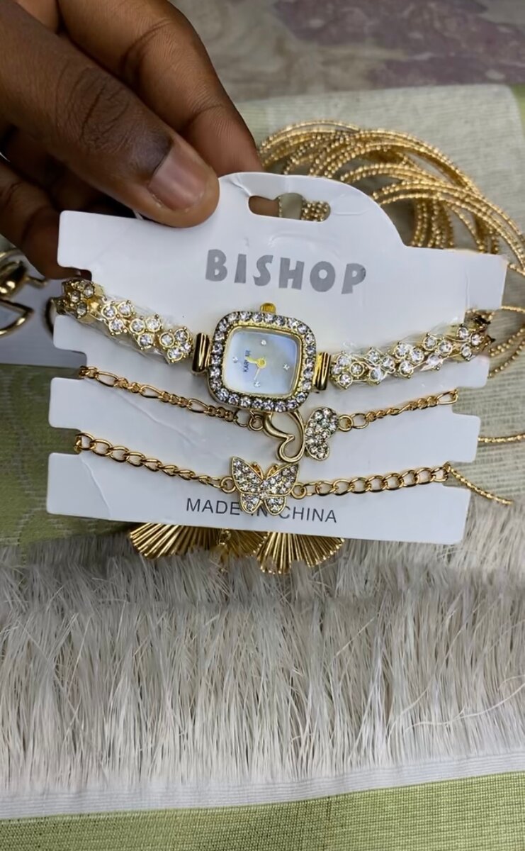 Découvrez cet ensemble élégant combinant une montre et des bracelets dorés incrustés de cristaux étincelants. Parfait pour ajouter une touche de luxe à toute tenue. Idéal pour les occasions spéciales ou un usage quotidien.