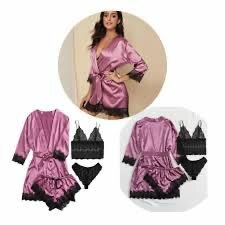 Optez pour cet élégant ensemble de nuit en satin rose, conçu pour allier confort et style. Composé d'un peignoir, d'une chemise de nuit, d'un haut et d'un short, cet ensemble est idéal pour vos moments de détente. Le satin doux au toucher et les délicats détails en dentelle ajoutent une touche de féminité et de luxe. Parfait pour des nuits paisibles ou pour vos instants de cocooning à la maison.