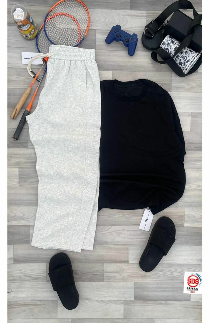 Idéal pour une tenue sportive et confortable, cet ensemble comprend un sweat-shirt noir et un pantalon de jogging gris clair. Parfait pour la salle de sport ou les loisirs à la maison. Conçu pour un confort maximal avec une coupe moderne et des matériaux respirants.
