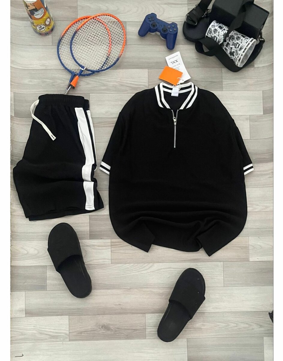 Optez pour ce confortable ensemble de sport noir, idéal pour vos séances d'entraînement ou pour un style décontracté au quotidien. Composé d'un t-shirt à col zippé et de shorts à bandes, cet ensemble assure un look moderne et confortable. Parfait pour les amateurs de sport ou pour un usage casual, il s'adapte à vos activités quotidiennes.