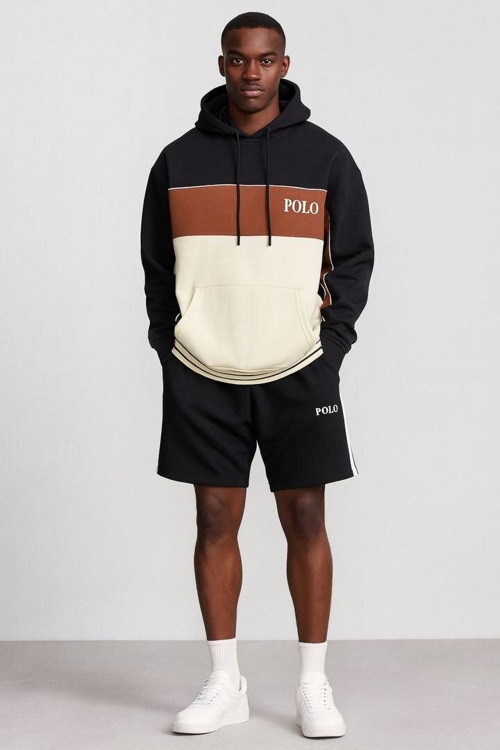 Cet ensemble de sport Polo pour homme combine style et confort. Le sweat à capuche color-block offre une allure moderne tandis que le short assure une liberté de mouvement optimale. Idéal pour les activités sportives ou un look décontracté au quotidien.
