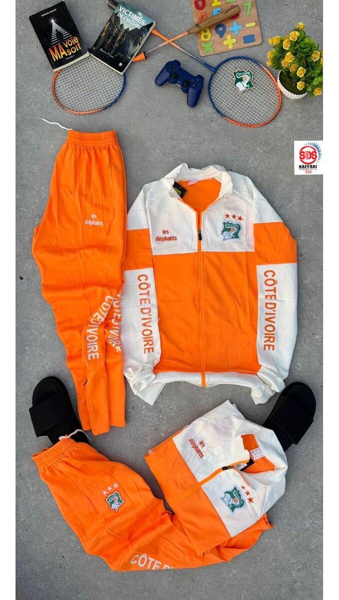 Optez pour cet ensemble de survêtement aux couleurs vives de la Côte d'Ivoire pour un look sportif et chic. Fabriqué en tissu confortable, idéal pour le sport ou les sorties décontractées.
