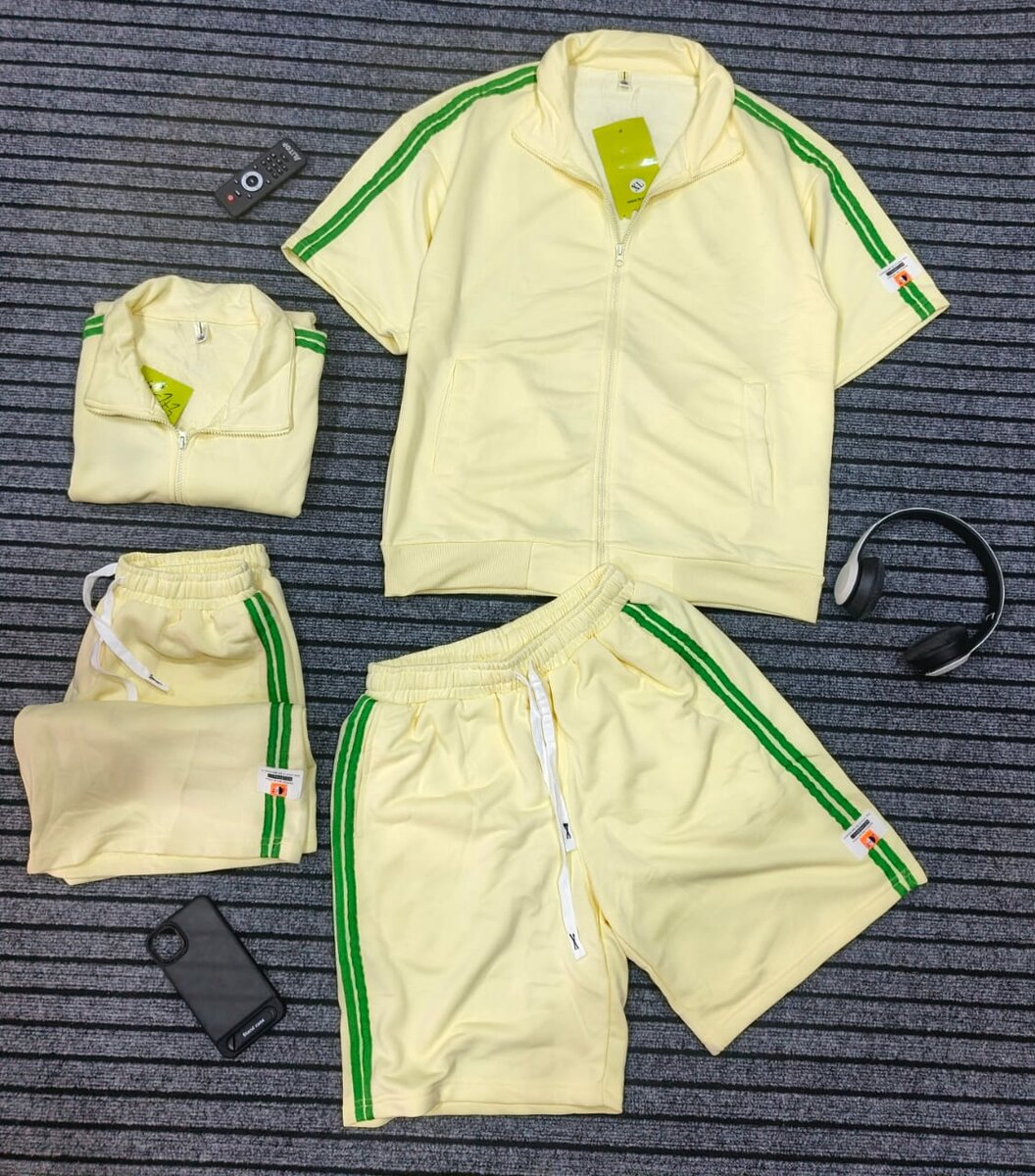 Optez pour cet ensemble de survêtement jaune confortable et stylé, idéal pour le sport ou les loisirs. Fabriqué en matériau doux, il assure un confort optimal. Avec ses bandes vertes contrastantes, cet ensemble complète parfaitement votre garde-robe décontractée.