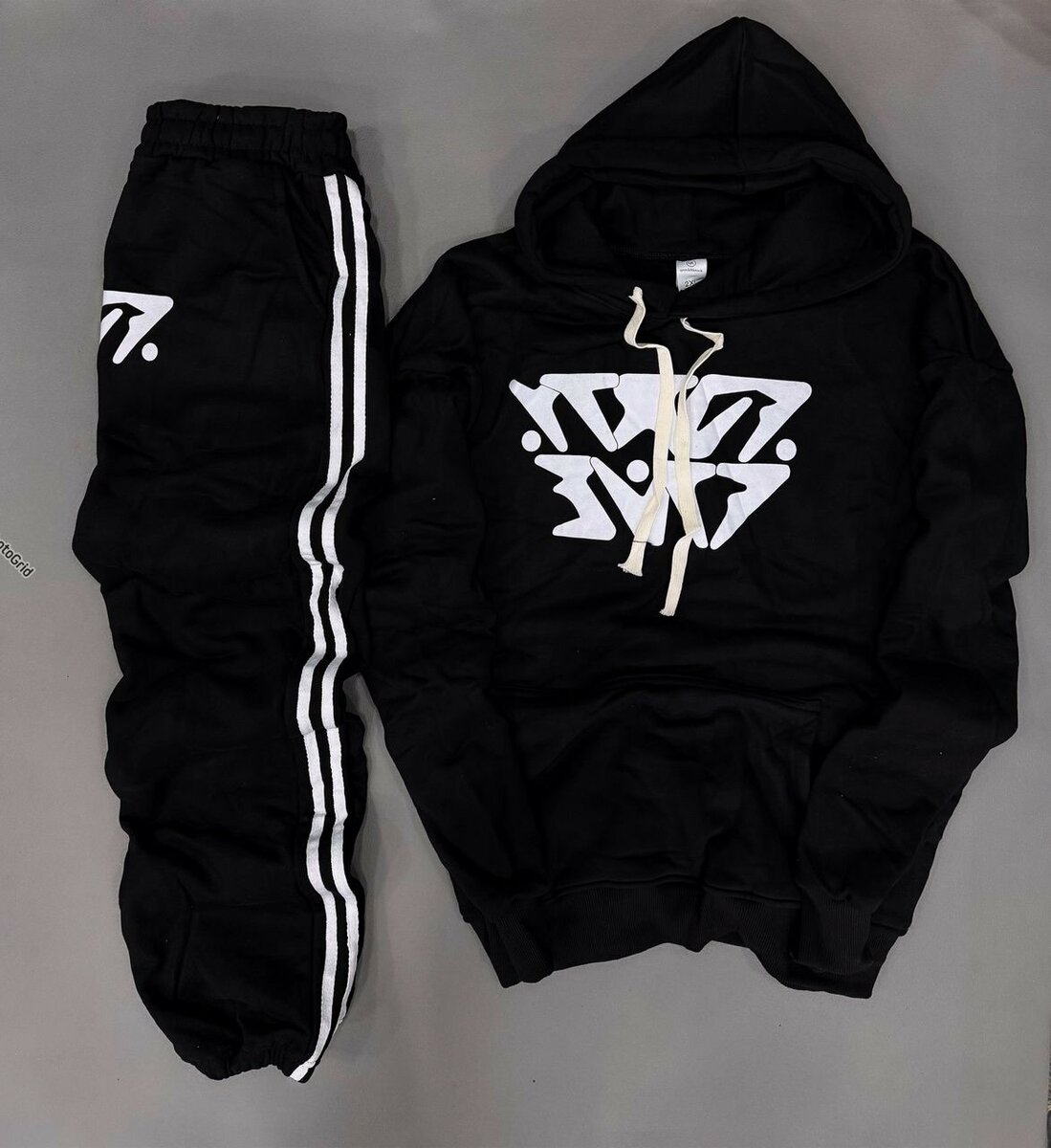 Découvrez cet ensemble de survêtement noir unisexe, parfait pour un look décontracté et stylé. Conçu avec des matériaux confortables, il est idéal pour le sport ou les journées de détente à la maison. Les bandes blanches sur le pantalon et le design graphique moderne sur le sweat ajoutent une touche tendance. Un excellent choix pour ceux qui apprécient le confort sans compromettre le style.