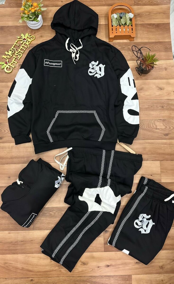 Ensemble de survêtement noir stylé avec motifs blancs. Idéal pour un look décontracté et moderne. Parfait pour le sport ou les sorties quotidiennes. Confortable et tendance. Composition douce et résistante. Un choix parfait pour les amateurs de mode.