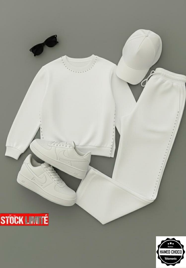 Découvre cet ensemble de survêtement unisexe ultra tendance, comprenant un sweat, jogging, casquette et baskets. Parfait pour le sport ou une tenue décontractée. Disponible en plusieurs couleurs.