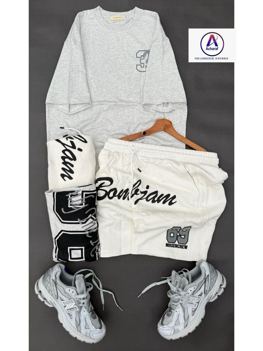 Découvrez cet ensemble tendance incluant un t-shirt confortable en gris clair et un short blanc avec style graphique. Parfait pour une allure décontractée, il s'accompagne de sneakers sportives assorties. Idéal pour les journées actives ou décontractées.