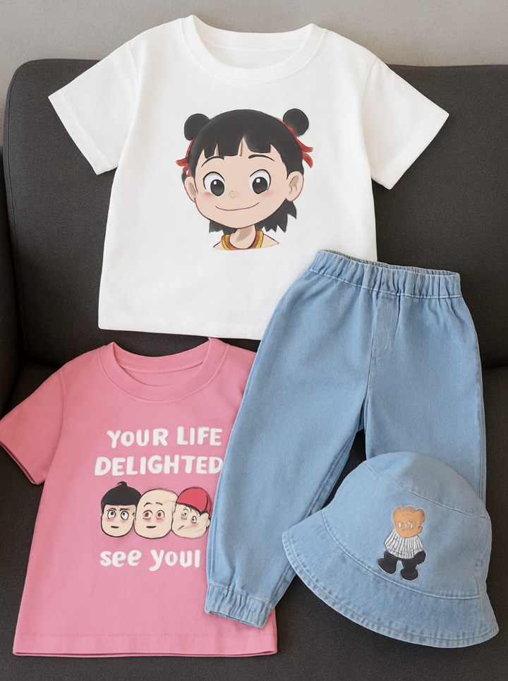 Adorable ensemble pour enfant avec un t-shirt imprimé personnage, pantalon en denim et chapeau assorti. Idéal pour le printemps et l'été, pour des sorties ou pour jouer. Confortable et stylé, parfait pour les petits explorateurs à la mode.