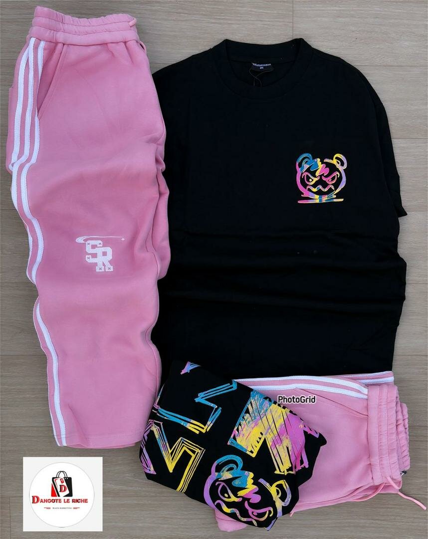 Optez pour cet ensemble tendance et coloré, composé d'un T-shirt noir avec motifs et d'un pantalon de jogging rose. Parfait pour un look casual et créatif.
