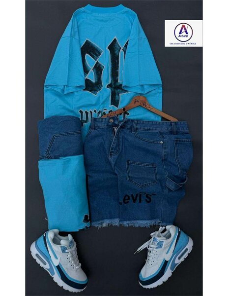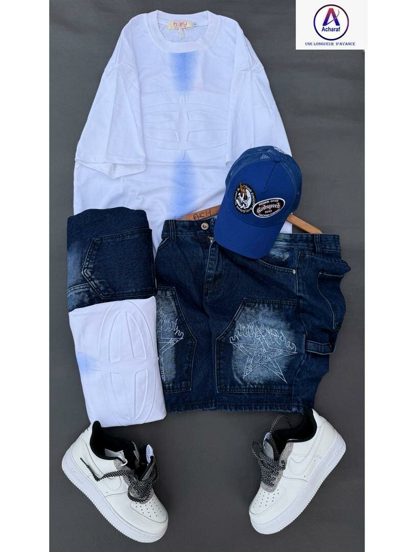 Ce ensemble décontracté pour homme comprend un t-shirt blanc, un short en jean avec des détails usés, une casquette bleue stylée et des baskets blanches tendance. Parfait pour un look cool et confortable, que ce soit pour une sortie entre amis ou une promenade en ville.