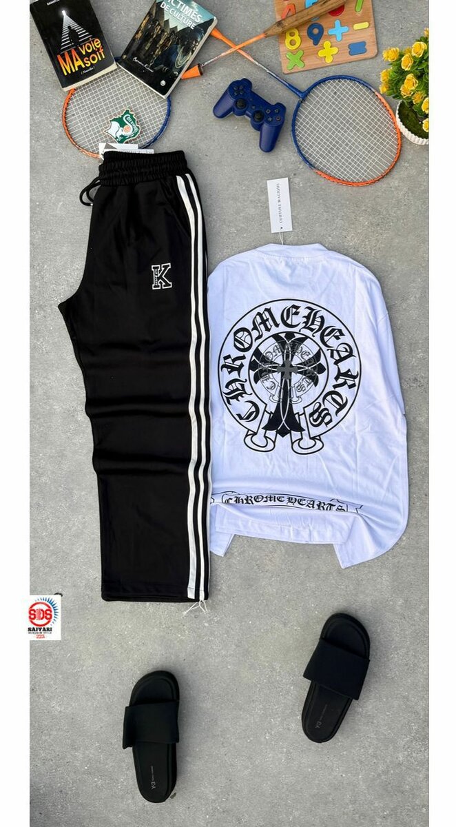 Découvrez l'ensemble décontracté parfait pour les journées relax. Composé d'un pantalon à bandes et d'un tee-shirt graphique, il apporte confort et style. Idéal pour la maison ou les sorties détente.